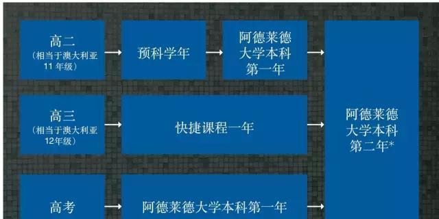 对于非高考学生,可选择入读阿德莱德大学的预科课程,预科学院将依据高二或高三的成绩招收学生入读快捷课程或阿德莱德大学预科课程。预科学院志在培养学生升入全球排名前1%高校所需的学习技能。