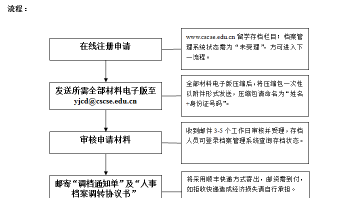 2、 自费出国(境)留学人员只可选择现场或电子邮箱申请办理的其中一种方式,如通过电子邮箱申请,“调档通知单”及“人事档案调转协议书”只能通过邮寄接收。