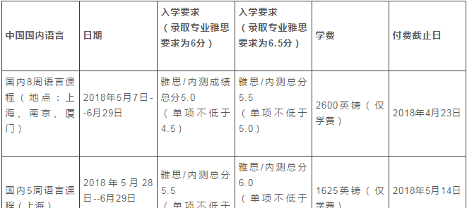 雅思成绩为5.0分(且单项不低于4.5分)的学生需要参加英国10周或中国8周的英语强化课程。