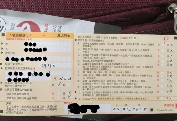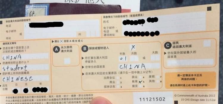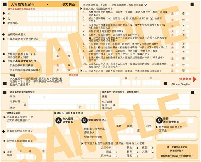 同学们需要注意了,入境卡有中英文两种,国内航空公司通常会提供中文版本的,因此你需要在飞机快要降落的时候注意空姐或空保的发放通知。假如你错过了飞机上发放的入境卡,也无需太过于担心,因为当你抵达澳洲过安检前,仍然有机会可以去填写,只不过仅有英文版本可以提供了。无论您是从那种方式获取的入境卡,值得注意的话,入境卡是您入境必备的硬件。