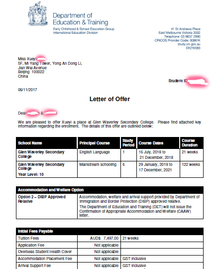学生的叔叔在澳洲,已经获得PR身份,希望接侄女去澳洲读10年级,目前9年级在读。家长指定格兰威夫利中学,但是这所名校,是众多国际生和当地学生抢着去申请的学校,满位严重。家长在2017年10月27日中国时间下午3:40签约,已经错过了澳洲的工作时间,全球留学网老师加班在周五晚上周六周日2天多时间内,搜集材料,指导学生和家长准备材料。