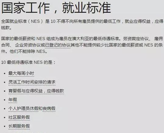 在澳洲,都有最低工作时薪,NationalEmploymentStandards(NES)全国就业标准还制定了10项基本的工作权利,其中包括: