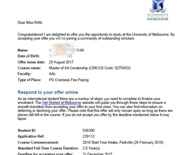 RAN同学最初选择的留学国家是加拿大,在大四上学期是就申请了加拿大六所大学。在提交申请后经过几个月后等来的结果却是加拿大六所大学全部拒录。学生当时很是失望几乎打算放弃留学想法,后来我和学生沟通后了解到学生最初的留学想法是考虑去国外深造的同时能将来有工作的机会。并且一定要选择世界排名比较靠前学校,了解到学生本科就读于北京电影学院均分中等偏上,北京电影学院本身就是一所艺术气息比较浓厚的学校,学生对艺术非常感兴趣,意向专业就是艺术相关的课程,通过了解给学生推荐了一些澳洲移民专业和艺术相关的专业,学校推荐了澳洲八大院校,学生只考虑悉尼或者墨尔本地区的学校,最终筛选完以后推荐了墨尔本大学的艺术管理专业,学生对此专业和墨尔本大学特别满意,但是均分刚刚达到墨尔本大学艺术管理专业的录取要求,并且时间也比较紧,墨尔本大学受理周期长,即使高出录取分数也不一定拿到录取。审理也存在更多不定因素。但是凭借多年的申请经验来说给学生做了一个尝试。同时,学生还申请了悉尼大学和新南威尔士大学的商科专业作为第二选择。最终经过两个月的等待,拿到了墨尔本大学的有条件录取。学生再经历了申请加拿大六所大学被拒录后最终拿到了QS 世界排名第41名的墨尔本大学艺术管理专业。学生对学校和专业都非常非常满意。现在学生已经开启了在澳洲墨尔本大学的留学学习之旅!!!