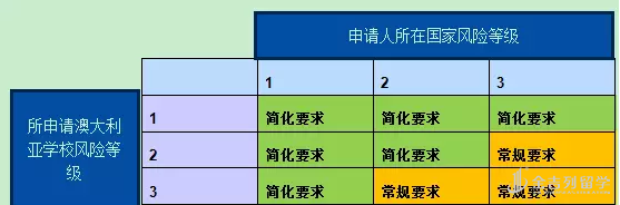 从SSVF正式启用后,澳大利亚在评估申请人的风险等级和对应的申请材料要求上发生了变化,采用了申请人所在国家风险级别和申请学校风险级别综合评分的方式。 澳大利亚移民部根据学校在过往的一年内申请签证的学生案例进行移民风险评估,分成三个等级;同时申请人所在国家也分为三个风险等级,1为最低风险等级,相反3为最高。 根据图表的规划,对应低风险的学生将享有简化签证材料的权利,可以不提供语言材料和资金能力证明,但是审批过程中移民局依然有权利要求申请人提供相关材料。而对于需要提供英文成绩证明或者审批过程中签证官要求提供的申请人,必须递交以下两项材料其中一样:1. 官方机构认证的语言成绩单2. 材料可豁免的证明Fourthly:无CoE 申请签证如果是澳洲境外申请,申请人在递交材料前必须一起提供学校开出的CoE。 如果是澳洲境内申请,学生可以在申请签证时只提供 Letter of Offer 或者CoE,但是CoE需要在签证获批前补交给移民局。Fifth:生活费标准上调 如果申请人被要求提供资金证明,那么则需要提供第一年的生活费,学费和旅费的证明。以往申请学生签或者监护人签证,官方给出的生活费标准是$18610澳元一年;新政后生活费有所上涨,学生/监护人是 $19830 澳元一年,配偶签证是$6940 澳元一年,小孩是$2970 澳元一年。Sixth:开放小学生留学申请 从7月1日开始,澳大利亚正式接受来自中国小学生的留学申请,要求是申请人年满6岁,且必须有监护人陪伴赴澳读书。要注意的是,一般中学以上的留学签证最长为5年,而小学生留学每次签证时间不会超过2年。如果中途有需要延长签证时间继续课程,可以寻求可靠中介机构来申请签证续签。Seventh:学生签证课业要求新政正式生效后,澳洲移民局要求持有500学生签证的留学生必须选择入读与相应签证同等级或更高级别(AQF)的课程,否则学生有可能面临违反澳洲学生签证条例,影响签证有效性。但是,从博士学位(AQF10)转为硕士学位(AQF9)不会受到此项规定的影响。Eighth:语言课程无限制 在原先政策中,凡是申请独立英语课程(ELICOS)或申请大学语言打包课程,澳洲移民部都有一定的时间限制。而7月1日之后,时长限制条例被取消。也就是说,同学们可以根据自身情况,申请任意时长的英文课程了。Ninth:短期课程申请可携带家属对于以往短期课程的留学生来说,澳洲规定申请入读12个月以下的申请人不能携带家庭成员一同递交签证申请的条款,在7月1日之后也被取消了。