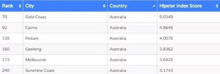 全球搬迁公司MoveHub根据城市内每100000居民所覆盖的素食餐厅、咖啡店、纹身工作室、古董专卖店、音像店的数量,按照“Hipster指数评分”将城市从一到十划分等级。