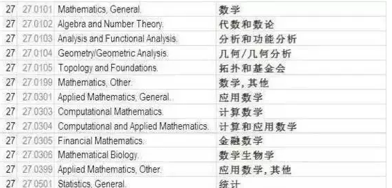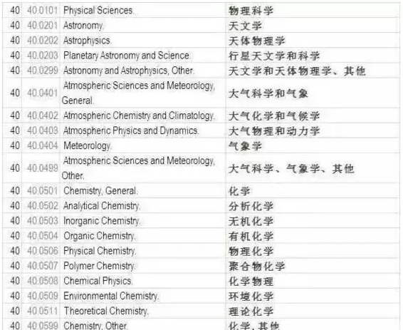另外,此列表对于“相关领域”进行了说明:相关领域是指与以上四大类领域相关的研究、创新或者新科技研发。列表中为各专业按领域划分制定了相应编号,STEM专业四大领域的CIPCode分别是:工程类(CIPcode14),生物科学类(CIPcode26),数学与统计学类(CIPcode27),物理科学类(CIPcode40)。一旦有新的STEM专业出现,会被自动添加到此列表中。