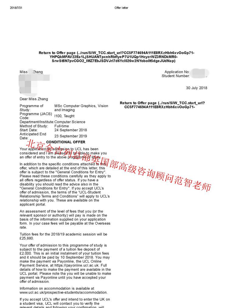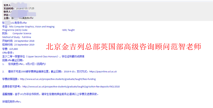 在我们的帮助下经过了 为期近一年的等待 在2018年7月31日终于拿到了心仪的冲刺院校G5精英大学:UCL 伦敦大学学院 2018年9月24日开学 MSc Computer Graphics, Vision and Imaging 计算机图形,视觉与成像 直接免雅思硕士正课录取。这几天 UCL正在处理最终未出结果的学生案例,在疯狂下拒信的情况下,通过我们的努力成功的帮助张同学拿到offer~ 我们在2017年10月份就投递了大学的申请,在其他大学都已经在2017年11月份拿到了录取offer的情况下,在我们都最终定校去KCL读研准备办签证的情况下,就在昨天,终于等来了UCL这迟来的爱!投递申请成功后 这多半年的时间我们无数次的跟催UCL出结果,在学生7月初本科毕业 我们在给学生换取KCL无条件offer的同时,我们又将张同学的学位证成绩单等材料发给了UCL做进一步跟催争取,最终功夫不负有心人,在我们的努力下,终于帮张同学争取来了G5精英大学UCL这迟来的录取通知书,迟来的爱!学生和家长高兴激动之余,也体现了我们不抛弃不放弃的立场与原则。帮学生拿到心仪冲刺院校的录取,最终入读理想的学校是我们一直以来的工作准则!希望在我们的帮助下让更多的优秀学子拿到录取,签证获签,顺利入学!