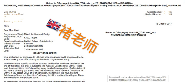 经过和全球留学网老师详细沟通后,老师给学生进行了非常专业的规划,因为虽然学生准备时间比较晚,但是作品集做的非常精细,所以全球留学网老师大胆帮学生定位比较高的院校,基本全部是世界前100的学校。同时,因为全球留学网老师具有丰富的文书写作经验,所以还帮助学生从PS的撰写、推荐老师选择、实习材料和获奖经历等各方面进行梳理挖掘,最大程度的帮学生争取录取。最终在老师耐心的指导以及赵同学的极力配合下,顺利拿到QS世界排名7的伦敦大学学院巴特莱建筑学院的OFFER,让赵同学圆梦英伦!