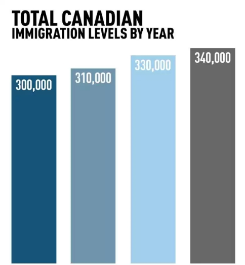 这个计划中,2018年,加拿大将安置31万移民;2019年增加到33万,2020年继续增加到34万;