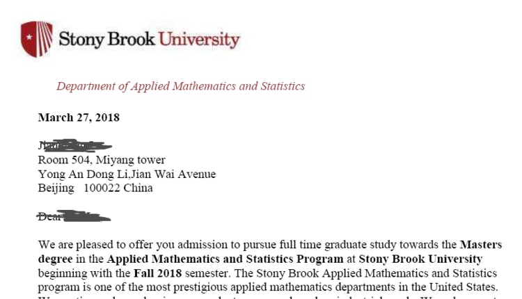 录取结果:纽约州立大学石溪分校