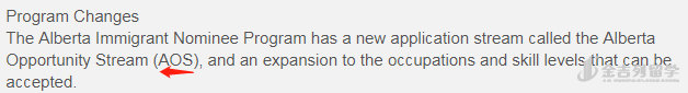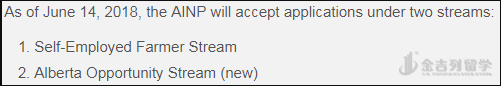 阿尔伯塔省移民提名计划有一个名为Alberta Opportunity Stream (AOS)的新申请渠道。截至2018年6月14日,AINP将接受两个流程下的申请