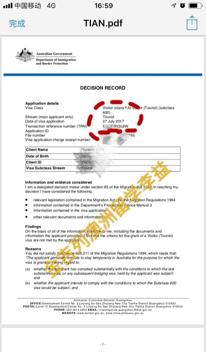 2. 客户于2017年两次申请赴澳旅游签证被拒
