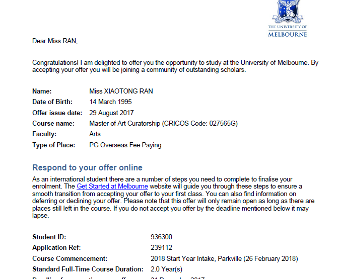 RAN同学最初选择的留学国家是加拿大,在大四上学期是就申请了加拿大六所大学。在提交申请后经过几个月后等来的结果却是加拿大六所大学全部拒录。学生当时很是失望几乎打算放弃留学想法,后来我和学生沟通后了解到学生最初的留学想法是考虑去国外深造的同时能将来有工作的机会。并且一定要选择世界排名比较靠前学校,了解到学生本科就读于北京电影学院均分中等偏上,北京电影学院本身就是一所艺术气息比较浓厚的学校,学生对艺术非常感兴趣,意向专业就是艺术相关的课程,通过了解给学生推荐了一些澳洲移民专业和艺术相关的专业,学校推荐了澳洲八大院校,学生只考虑悉尼或者墨尔本地区的学校,最终筛选完以后推荐了墨尔本大学的艺术管理专业,学生对此专业和墨尔本大学特别满意,但是均分刚刚达到墨尔本大学艺术管理专业的录取要求,并且时间也比较紧,墨尔本大学受理周期长,即使高出录取分数也不一定拿到录取。审理也存在更多不定因素。但是凭借多年的申请经验来说给学生做了一个尝试。同时,学生还申请了悉尼大学和新南威尔士大学的商科专业作为第二选择。最终经过两个月的等待,拿到了墨尔本大学的有条件录取。学生再经历了申请加拿大六所大学被拒录后最终拿到了QS世界排名第41名的墨尔本大学艺术管理专业。学生对学校和专业都非常非常满意。现在学生已经开启了在澳洲墨尔本大学的留学学习之旅!!!