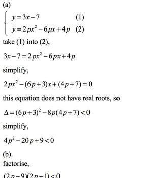 这道题其实也并不难,唯一的难点在于如何把这段话“The straight line with equationy=3x-7 does not cross or touch the curve with equation y=2px2-6px+4p”从文字表达转换为数学语言。