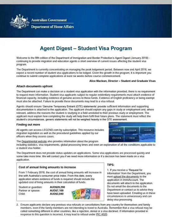通知一:从2018年2月1日起,澳洲学生签证的一年生活费要求从原来的每年19830澳元涨价为每年20290澳元,随行配偶和孩子的生活费要求也有增长,具体见下: