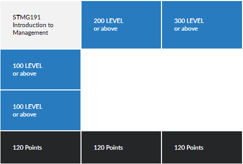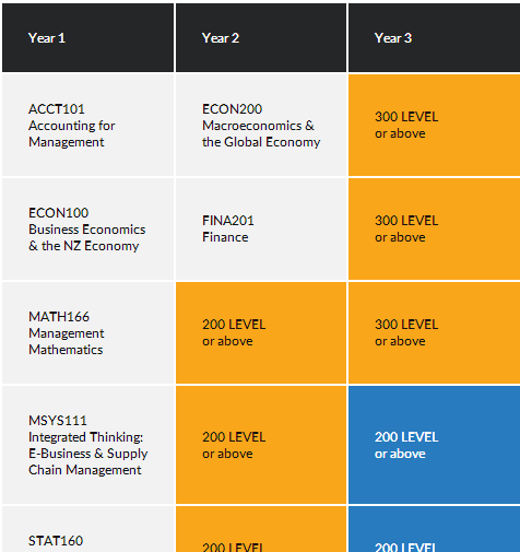 白色部分为必修课,像国内一样,大学第一年是打基础,所以BBA下面的3个专业---经济、会计、金融的学生一起上课。第一年需要修满8门课,共120个学分。平均每个学期修4门课,学生可以根据自己的需求随意安排这个学期想学哪门课,只要上课时间没有冲突,且这门课该学期有开设即可。蓝色部分是选修课。学生可以自行选择怀卡托大学内任何100 level的课程,无论是商科、文学、或教育等,只要是自己感兴趣的都能学。