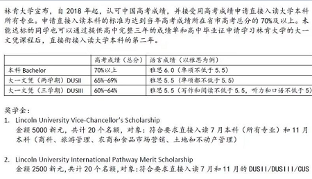 面向符合凭高考成绩直接入读林肯大学本科课程的国际学生,包括7月入读本科所有专业、11月入读商科、旅游管理、农商和食品市场营销、土地和不动产管理的本科课程,奖学金金额为5000新西兰元,奖学金名额为20个。