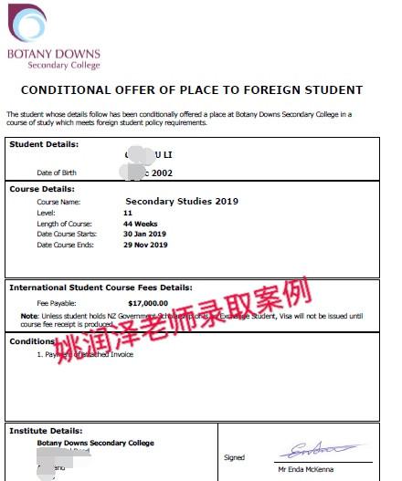 恭喜李同学!太开心了!因为新西兰高中一般为提前一年申请。学生递交之时已经为8月中旬。一周就下Offer。在这里要感谢我们的团队内部协作工作分工明确来为学生达到最终录取的目的。瑞鹏留学网老师也是抱着尝试的态度来给学生申请!学校还有最后一个名额留给了我们。同时也是申请的11年级(NCEA的第一年)所以在录取上更加给我们团队增加信心!