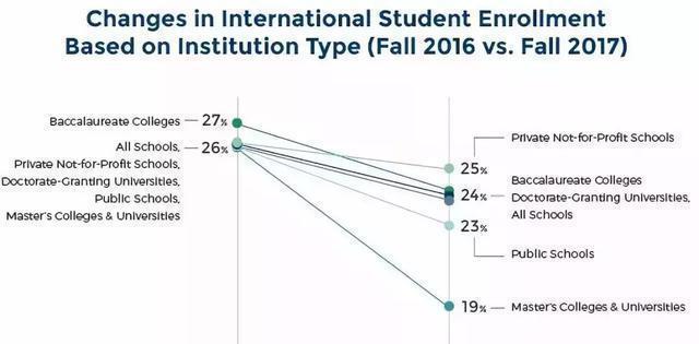 2018.01调查表明大学整体国际生入学减少,500个大学较去年调查平均结果显示,国际生入学减少高达7%,对比2016-2017的3%进一步减少。同时,大规模大学内部出现财政紧缩。举例密苏里大学,入学人数减少相比去年达1500人,减幅超60%。