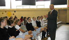 图为美国国会议员Paul Tonk,来校授课12年级美国政府论。Paul Tonk自2009年起任国会议员,全美科学、空间、科技委员会调查小组高级会员,能源环境小组会员。